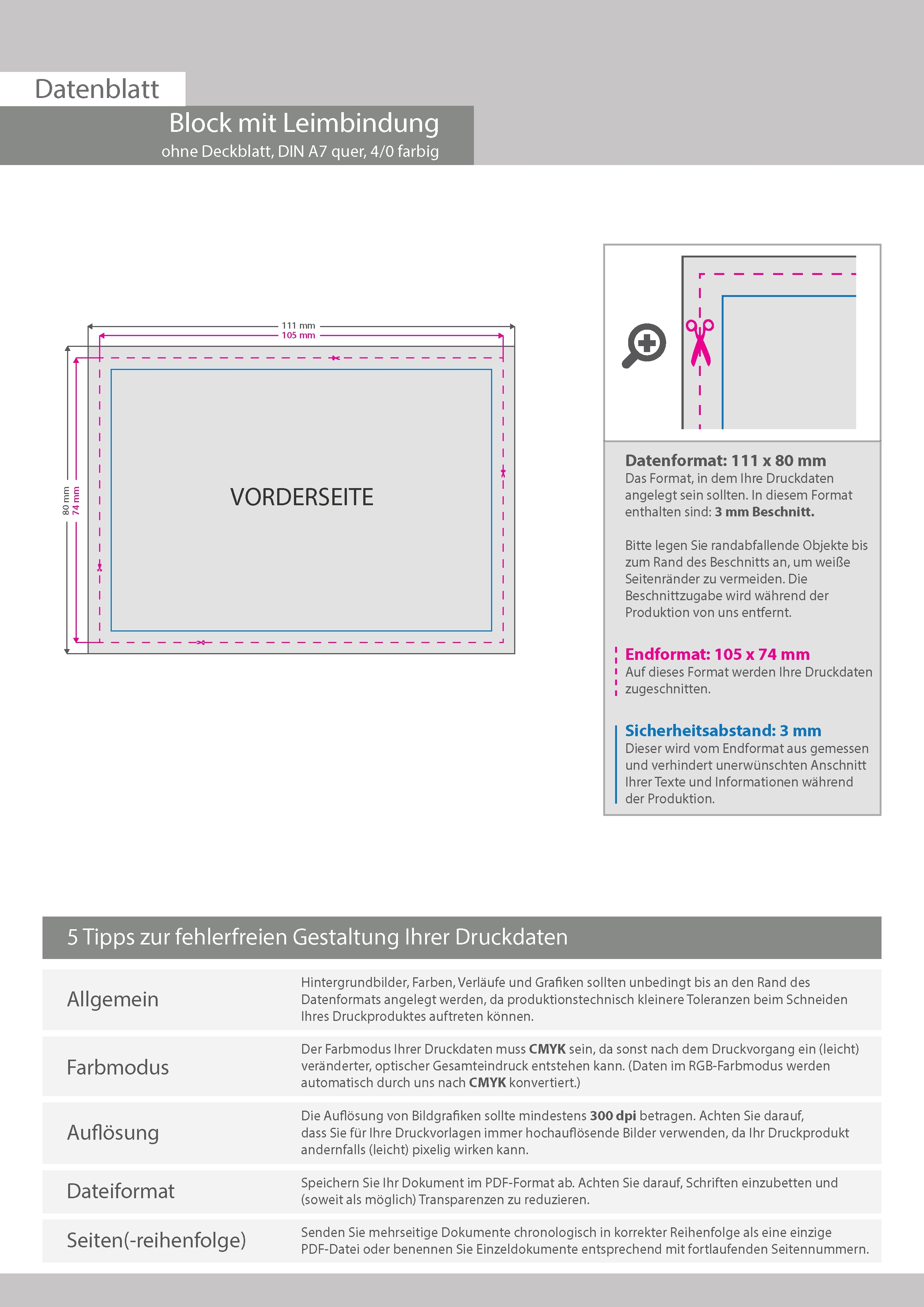 Block mit Leimbindung, DIN A7 quer, 100 Blatt, 4/0 farbig einseitig bedruckt