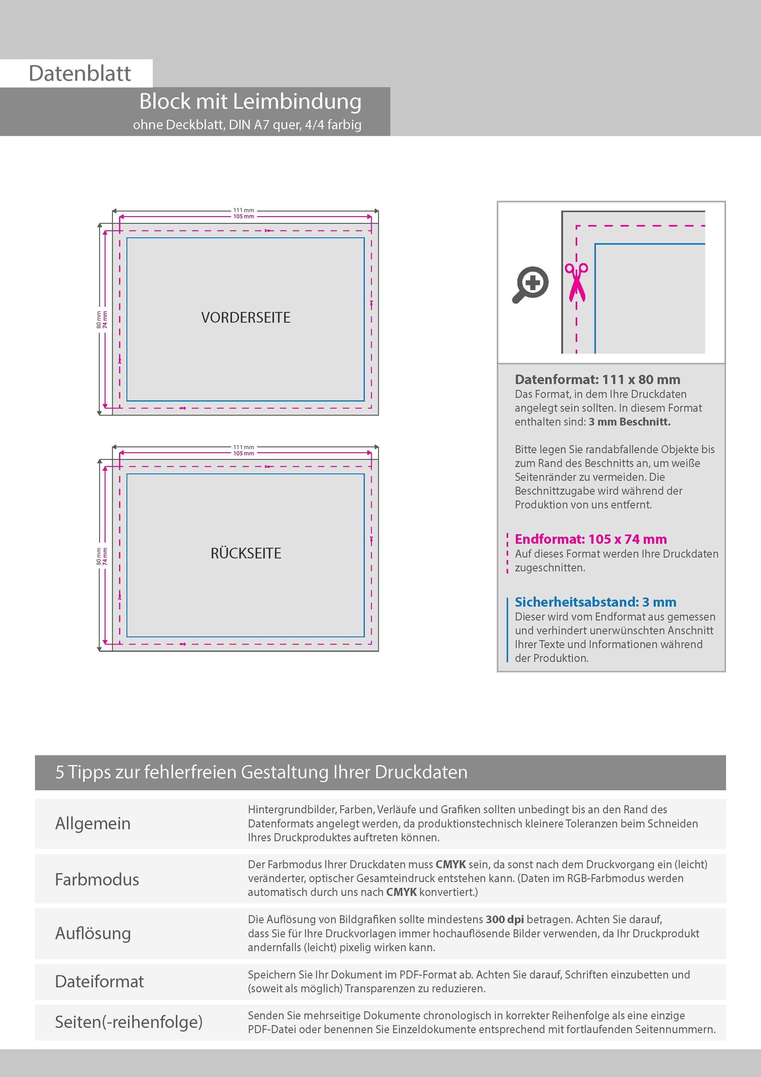 Block mit Leimbindung, DIN A7 quer, 25 Blatt, 4/4 farbig beidseitig bedruckt