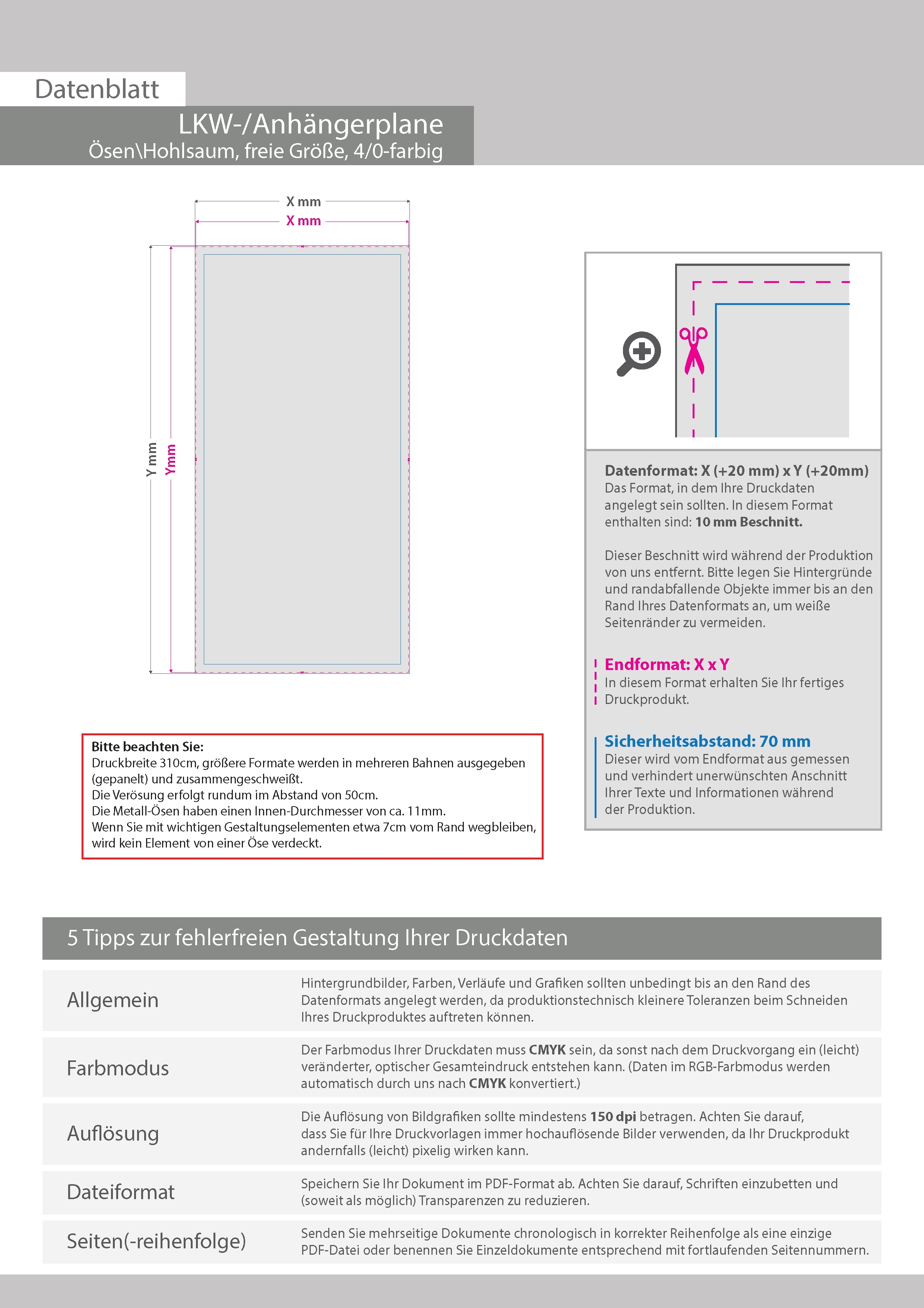 Hochwertige LKW- und Anhängerplane, 4/0-farbig bedruckt, Umsäumt + Ösen im Abstand von 50 cm rundum