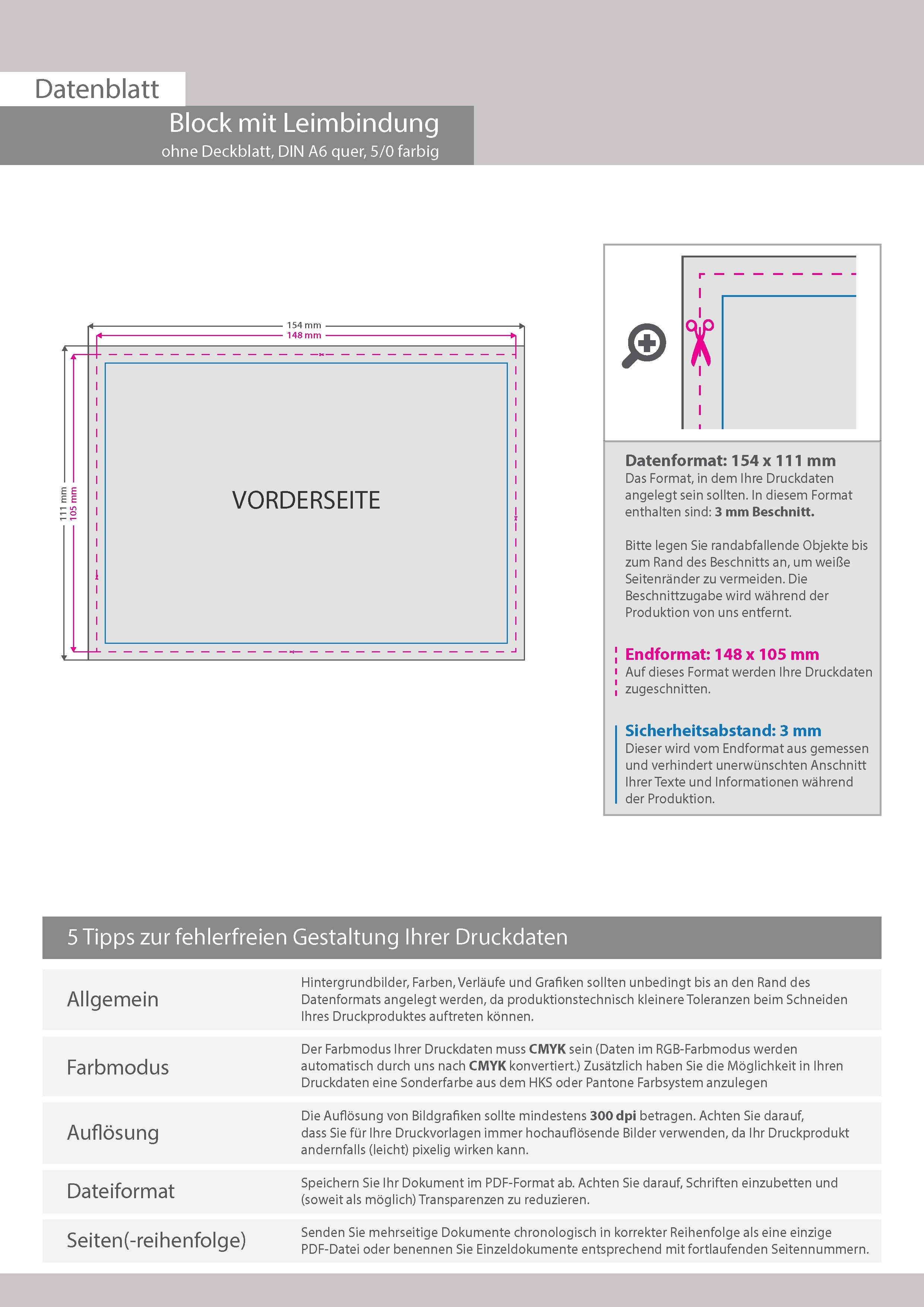 Block mit Leimbindung, DIN A6 quer, 200 Blatt, 5/0 farbig einseitig bedruckt (CMYK 4-farbig + 1 Sonderfarbe HKS oder Pantone)