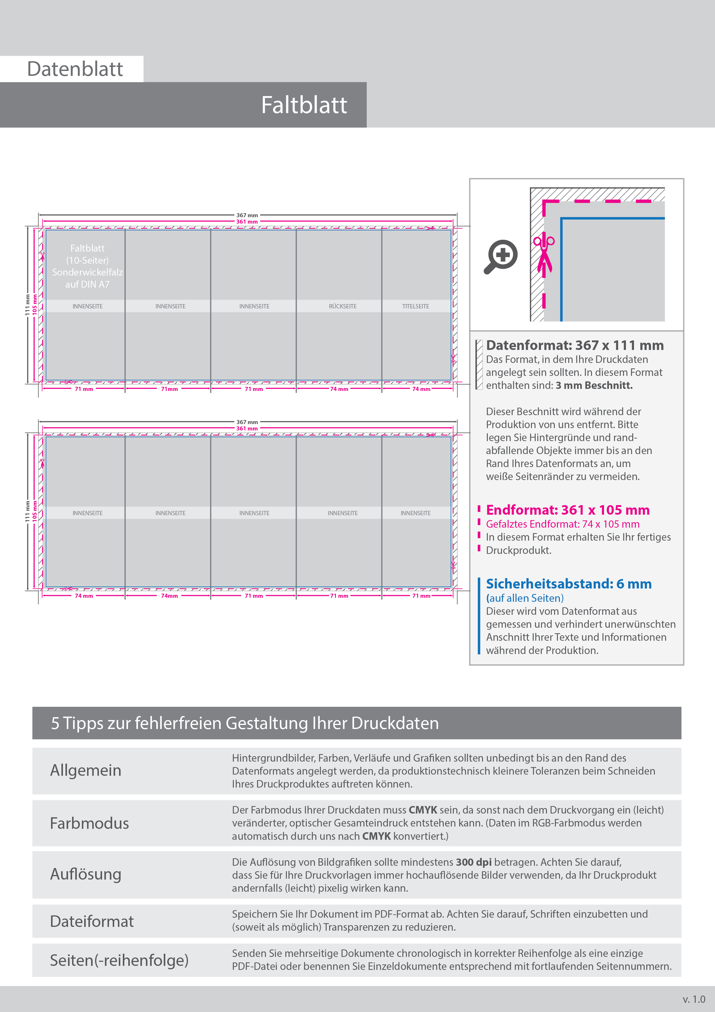 Faltblatt, gefalzt auf DIN A7, vertikaler Sonderwickelfalz, 10-seitig