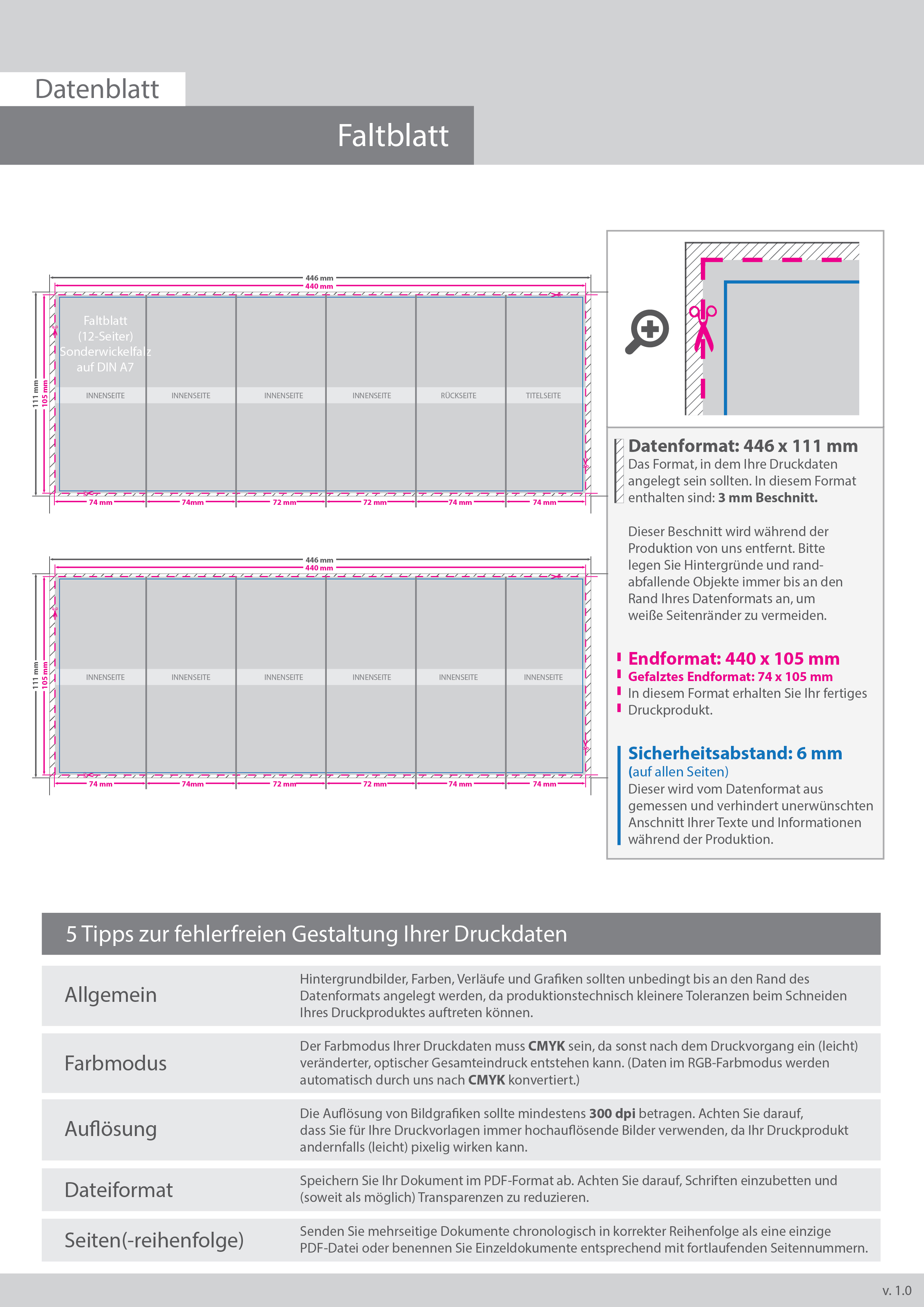 Faltblatt, gefalzt auf DIN A7, vertikaler Sonderwickelfalz, 12-seitig