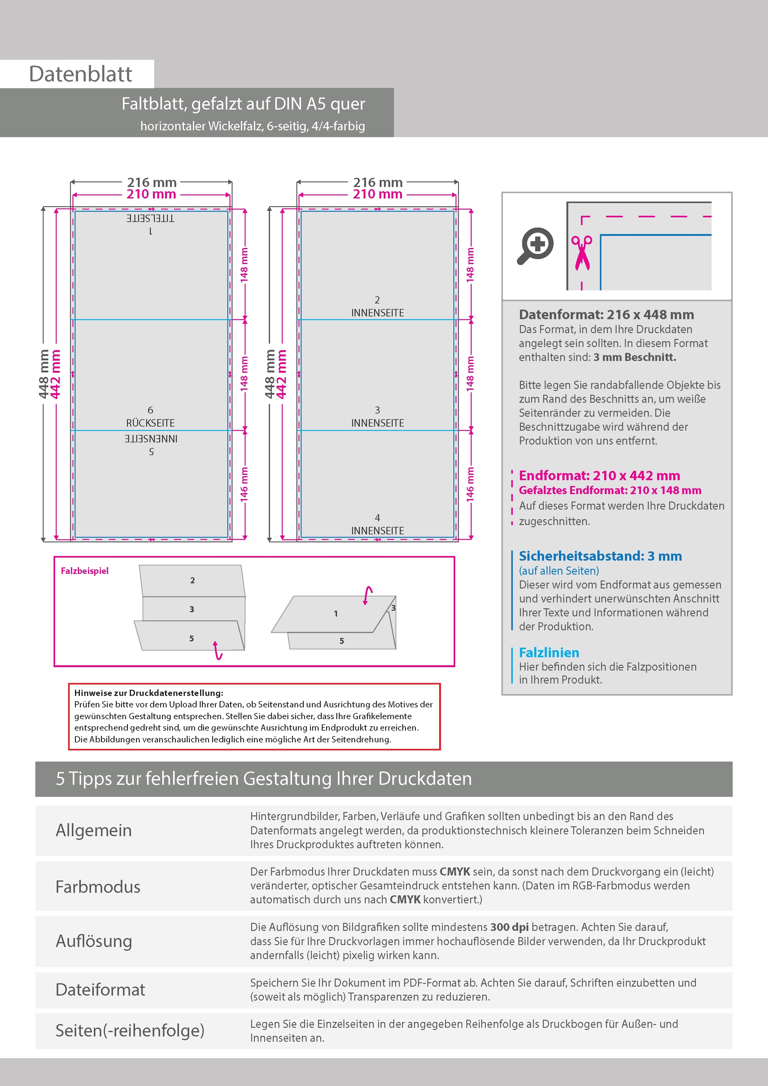 Faltblatt, gefalzt auf DIN A5 quer, horizontaler Wickelfalz, 6-seitig